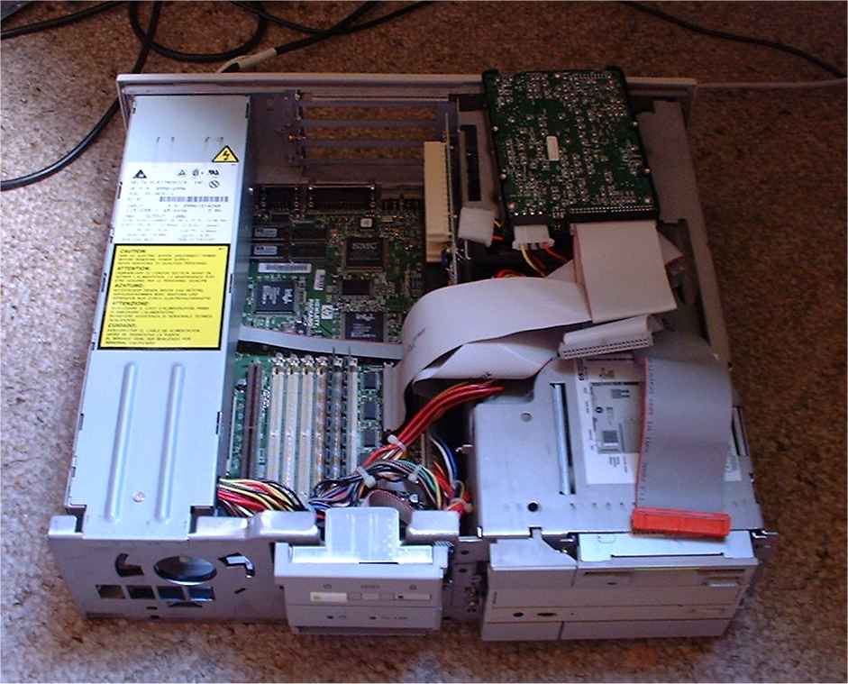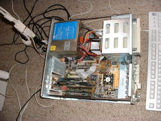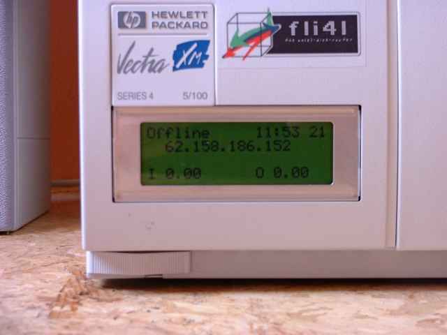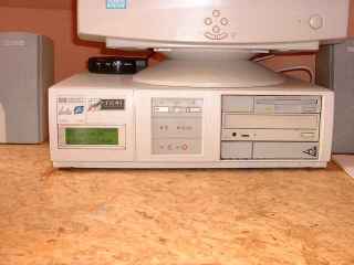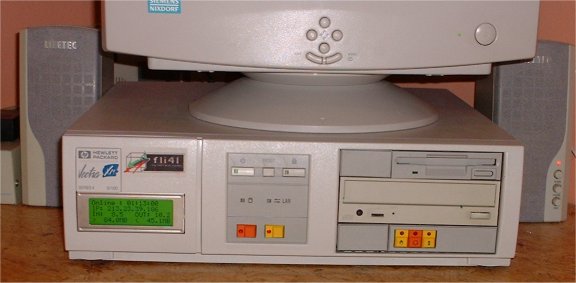 Ich hatte ein HP Vectra XM Series 4 5/100 auf der ComBär in Berlin erstanden (Technische Daten). Das Gehäuse war recht flach. Die Erweiterungsmöglichkeiten waren zwar etwas beschränkt, aber die Zusatzkarten wurden waagerecht eingebaut. Er war mit einem Pentium 100 MHz ausgerüstet. Aufgrund der Netzteilbauform, hatte er nur einen passiven Kühler (leise....), 32 MB Hauptspeicher steckten auf dem Board. Da er auch schon mit einer 10 MBit Netzwerkkarte ausgerüstet war, war ich nun auch schon für DSL ausgerüstet. Für die interne Netzwerkanbindung baute ich noch eine 100 MBit Netzwerkkarte ein.